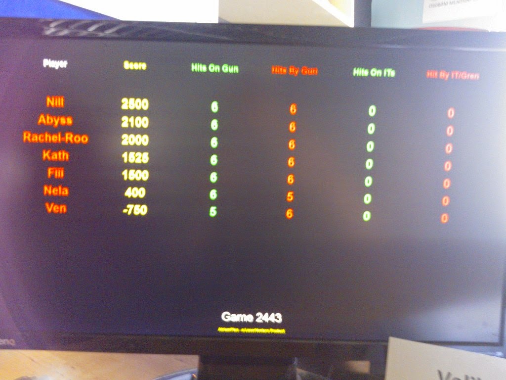 Nakonec jsem ale úspěšně dorazila na místo srazu. První zastávkou měly být Laser Games. Byla jsem vážně ráda za svoji městskou kartu do MHD, protože když jsem viděla holky, jak se perou s kusovými lístky, musela jsem se jenom smát. Nakonec jsme ve složení já, Abyss, Will, Fí, Kath, Rachel a Nel-ly dorazily na místo. Laser games jsem nikdy nehrála, ale byl to vážně skvělý zážitek. Člověk by neřekl, jak se při tom naběhá. Sice jsem skončila poslední, ale co na tom? Voják ze mě prostě nebude. Níže se můžete podívat na výsledky. A abyste věděli, kdo je to ten Nill.... To je nová přezdívka Will, kterou nám přejmenovali.